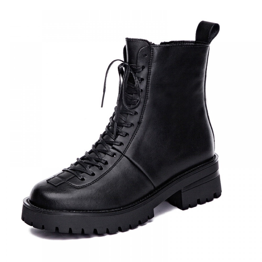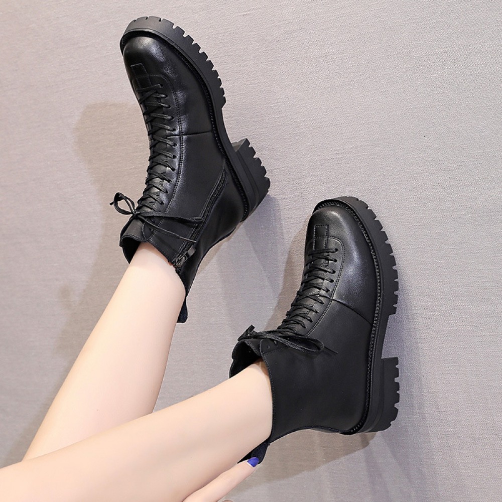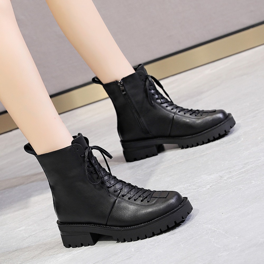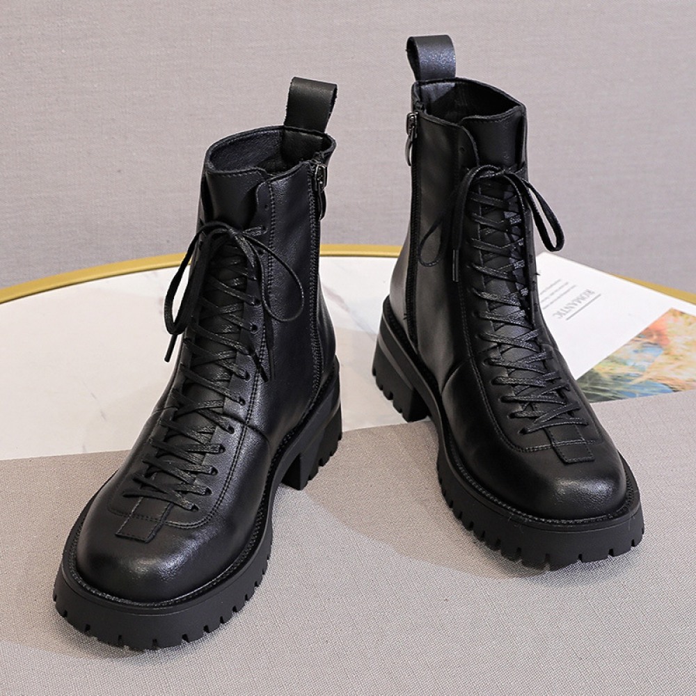 Women's Autumn New Thick-Soled Leather Boots Round Toe Thin Mid-Tube Martin Boots